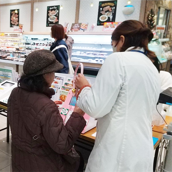 野菜の摂取量・血管年齢・骨健康度・肌年齢と筋肉量や内臓脂肪をはかることがができる体組成計の測定をしていただけます。また、測定にあわせた健康レシピも配布しています。