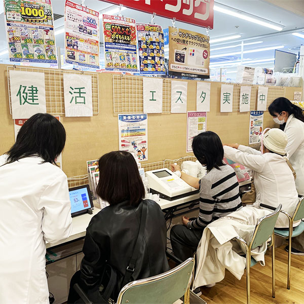 野菜の摂取量・血管年齢・骨健康度・肌年齢と筋肉量や内臓脂肪をはかることがができる体組成計の測定をしていただけます。また、測定にあわせた健康レシピも配布しています。