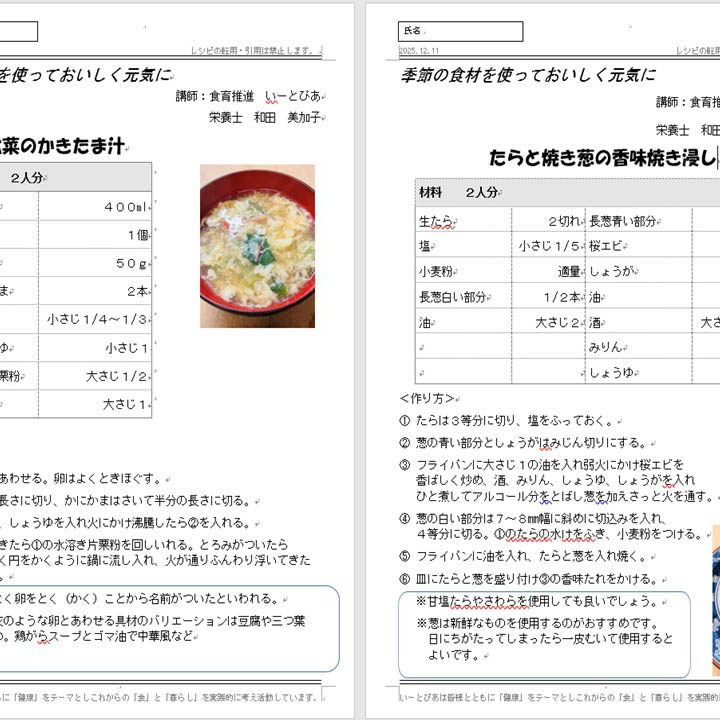 それぞれの料理について簡単につくるポイントと栄養と健康についてのお話