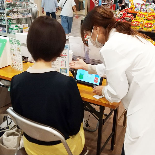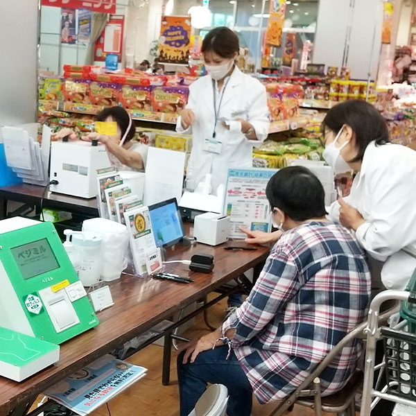 野菜の摂取量・血管年齢・骨健康度・肌年齢と筋肉量や内臓脂肪をはかることがができる体組成計の測定をしていただけます。また、測定にあわせた健康レシピも配布しています。